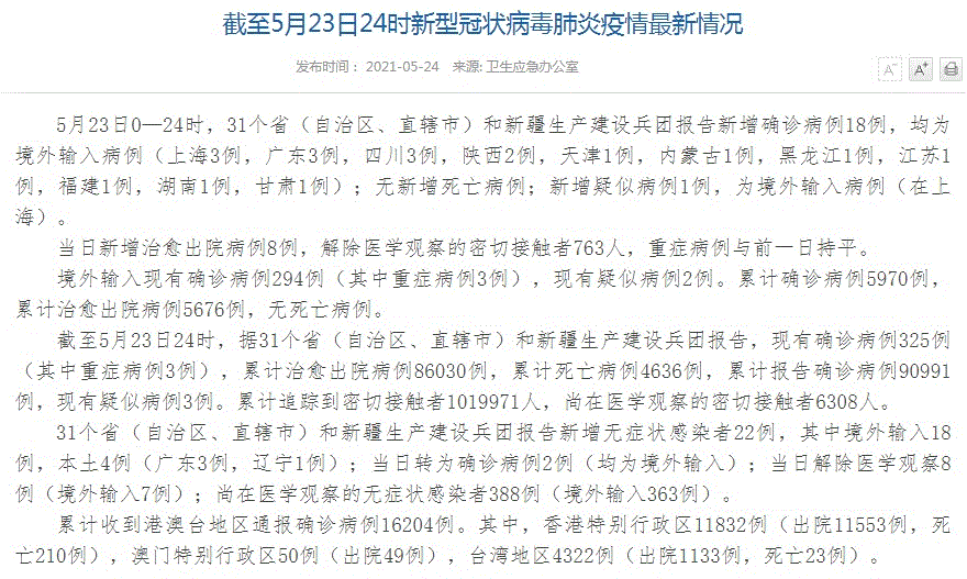 FX168财经报社(香港)讯 根据中国国家卫健委5月24日最新通报,5月23日0—24时,31个省(自治区、直辖市)和新疆生产建设兵团报告新增确诊病例18例,均为境外输入病例(上海3例,广东3例,四川3例,陕西2例,天津1例,内蒙古1例,黑龙江1例,江苏1例,福建1例,湖南1例,甘肃1例);无新增死亡病例;新增疑似病例1例,为境外输入病例(在上海)。