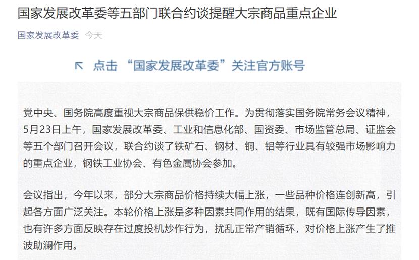据“国家发展改革委”微信公众号消息,党中央、国务院高度重视大宗商品保供稳价工作。为贯彻落实国务院常务会议精神,5月23日上午,国家发展改革委、工业和信息化部、国资委、市场监管总局、证监会等五个部门召开会议,联合约谈了铁矿石、钢材、铜、铝等行业具有较强市场影响力的重点企业,钢铁工业协会、有色金属协会参加。