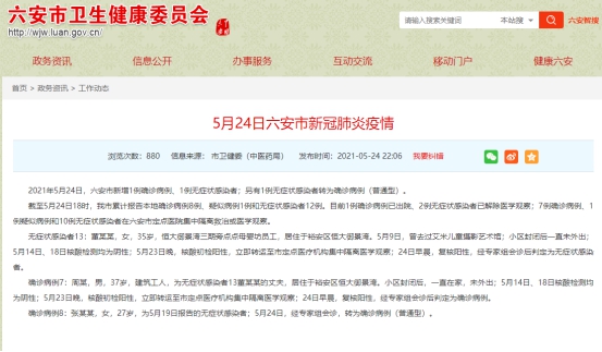 六安市卫健委最新通报,2021年5月24日,六安市新增1例确诊病例、1例无症状感染者;另有1例无症状感染者转为确诊病例(普通型)。