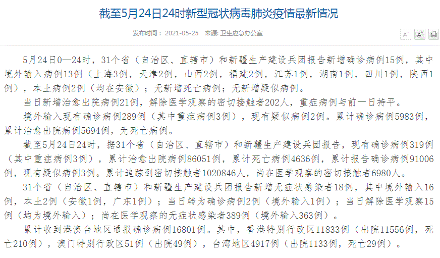 FX168财经报社(香港)讯 根据中国国家卫健委5月25日最新通报,5月24日0—24时,31个省(自治区、直辖市)和新疆生产建设兵团报告新增确诊病例15例,其中境外输入病例13例(上海3例,天津2例,山西2例,福建2例,江苏1例,湖南1例,四川1例,陕西1例),本土病例2例(均在安徽);无新增死亡病例;无新增疑似病例。