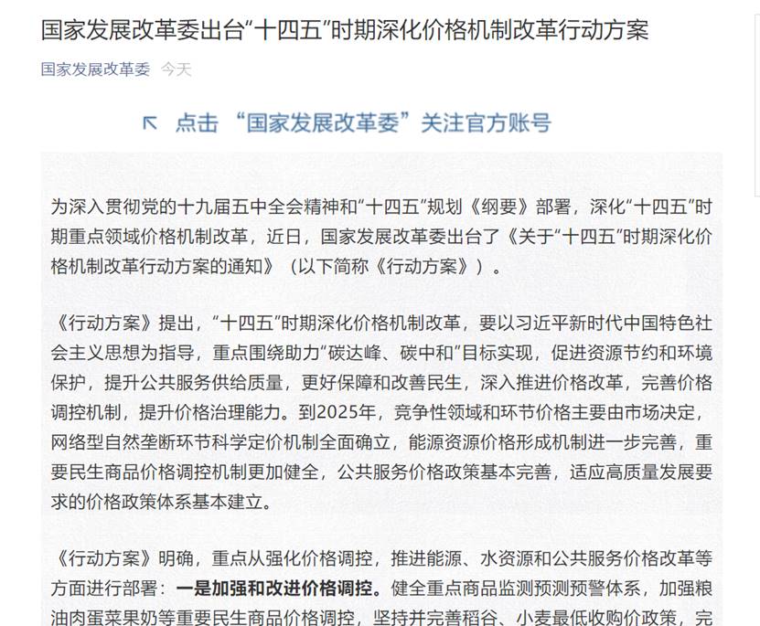 为深入贯彻党的十九届五中全会精神和“十四五”规划《纲要》部署,深化“十四五”时期重点领域价格机制改革,近日,国家发展改革委出台了《关于“十四五”时期深化价格机制改革行动方案的通知》(以下简称《行动方案》)。