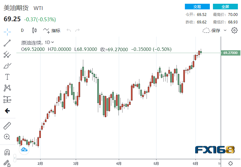 两大原油期货当日双双收跌。截至发稿,美国WTI原油7月期货收跌39美分,跌幅0.56%,至69.23美元/桶;布伦特8月原油期货收跌40美分,跌幅0.55%,至71.49美元/桶。由于需求日益激增,美油上周五盘中一举突破70美元大关,创下了自2018年以来的最高水平,之后略有回落,收报69.62美元/桶。布油上周五盘中一度突破72美元。
