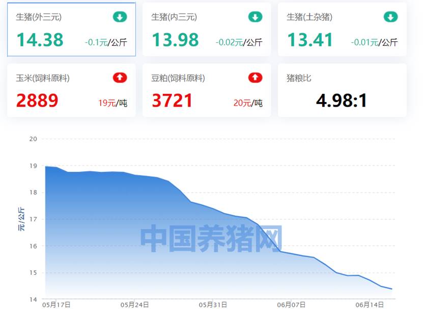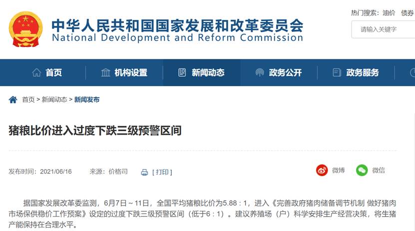 6月16日,国家发改委指出:“近期,由于大体重生猪集中出栏、进口冻猪肉增加及季节性需求偏弱等因素叠加影响,生猪价格持续下降。据我委监测,6月7日~11日,全国平均猪粮比价为5.88∶1,进入《完善政府猪肉储备调节机制 做好猪肉市场保供稳价工作预案》(以下简称《预案》)设定的过度下跌三级预警区间。6月16日,我委对外发布生猪价格过度下跌三级预警,提示养殖场(户)科学安排生产经营决策,将生猪产能保持在合理水平。