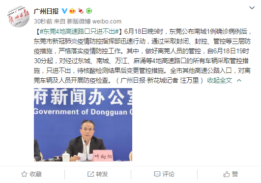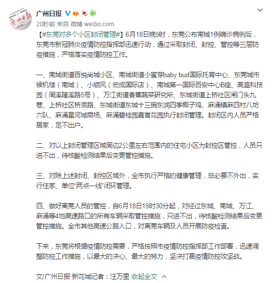 6月18日晚9时,东莞公布南城1例确诊病例后,东莞市新冠肺炎疫情防控指挥部迅速行动,通过采取封闭、封控、管控等三层防疫措施,严格落实疫情防控工作。