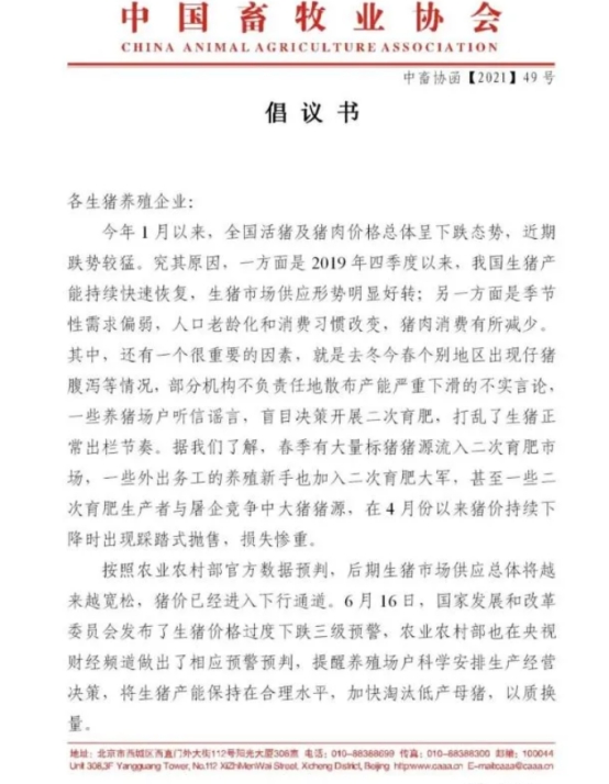 6月18日,中国畜牧业协会发布倡议书,猪价下行阶段不要恐慌,更不要以赌博心态安排生产。倡议书称,市场的力量是强大的。希望大家多关注农业农村部官网发布的生猪生产和市场数据,按照正常生产计划有序出栏,在价格下行阶段不要恐慌,更不要听信谣言,以赌博心态安排生产。优胜劣汰是市场法则,5月份生猪养殖的亏损面为9.7%,一些优秀的养殖场能把成本控制在每斤6元以内,这说明行情不好到时候也有赚钱的。建议加快淘汰低产母猪,特别是淘汰留作种用的三元肥猪,提高母猪繁殖效率,提高饲料转化率,增强竞争力。