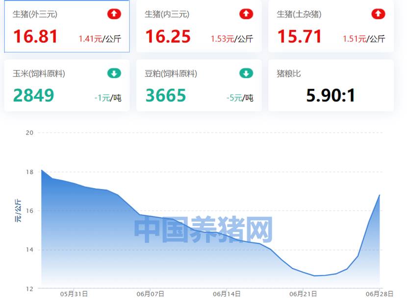 与此同时,猪价全面反弹。据中国养猪网系统监测最新数据,6月28日,生猪(外三元)均价为16.81元/公斤,较昨日上涨1.41元/公斤。环比下跌6.97%,同比下跌51.97%。