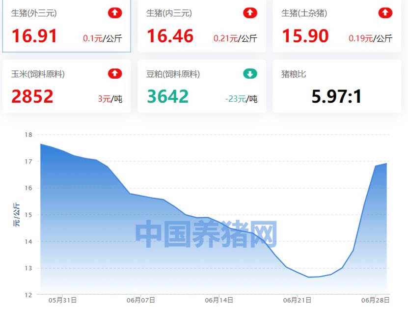 与此同时,猪价继续反弹。据中国养猪网系统监测最新数据,6月29日,生猪(外三元)均价为16.91元/公斤,较昨日上涨0.10元/公斤。环比下跌4.08%,同比下跌52.26%。