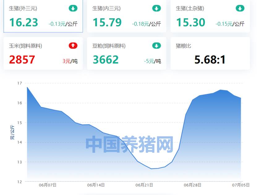 生猪价格方面,据中国养猪网系统监测最新数据,7月5日,生猪(外三元)均价为16.23元/公斤,较昨日下跌0.13元/公斤。环比下跌0.37%,同比下跌55.34%。