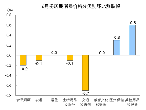 6月份,全国居民消费价格环比下降0.1%。其中,城市下降0.1%,农村下降0.2%;食品价格下降0.3%,非食品价格下降0.1%;消费品价格下降0.2%,服务价格上涨0.1%。