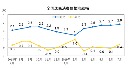 FX168财经报社(香港)讯 中国国家统计局周五(8月9日)公布数据显示,2019年7月份,全国居民消费价格同比上涨2.8%。其中,城市上涨2.7%,农村上涨2.9%;食品价格上涨9.1%,非食品价格上涨1.3%;消费品价格上涨3.4%,服务价格上涨1.8%。1—7月平均,全国居民消费价格比去年同期上涨2.3%。