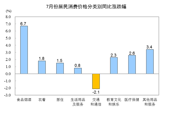 7月份,食品烟酒价格同比上涨6.7%,影响CPI(居民消费价格指数)上涨约1.95个百分点。其中,鲜果价格上涨39.1%,影响CPI上涨约0.63个百分点;畜肉类价格上涨18.2%,影响CPI上涨约0.75个百分点(猪肉价格上涨27.0%,影响CPI上涨约0.59个百分点);鸡蛋价格上涨11.4%,影响CPI上涨约0.06个百分点;禽肉类价格上涨7.6%,影响CPI上涨约0.09个百分点;鲜菜价格上涨5.2%,影响CPI上涨约0.12个百分点;粮食价格上涨0.6%,影响CPI上涨约0.01个百分点。