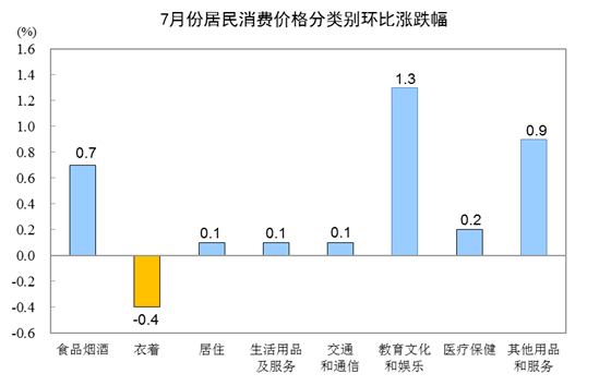 7月份,全国居民消费价格环比上涨0.4%。其中,城市上涨0.4%,农村上涨0.3%;食品价格上涨0.9%,非食品价格上涨0.3%;消费品价格上涨0.2%,服务价格上涨0.7%。