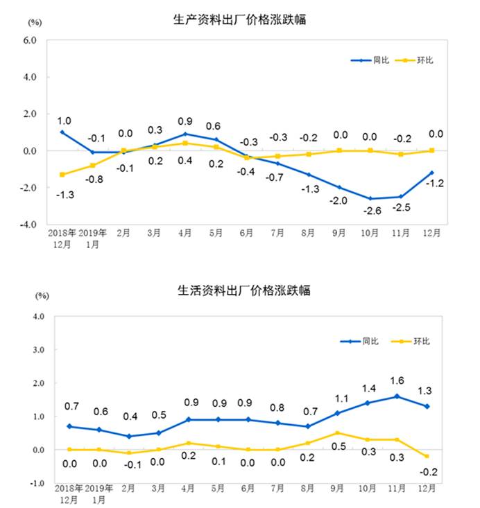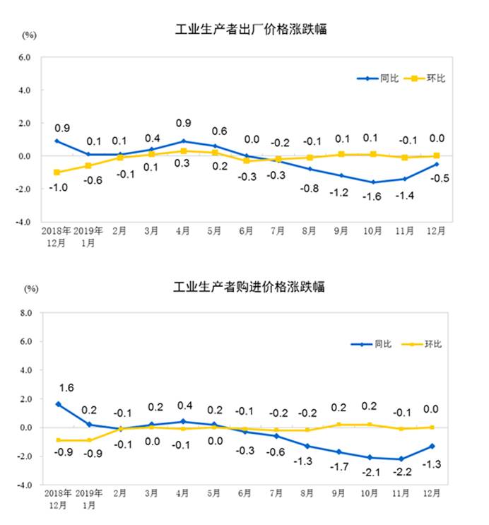 FX168财经报社(香港)讯 中国国家统计局周四(1月9日)公布数据显示,2019年12月份,全国工业生产者出厂价格同比下降0.5%,环比持平;工业生产者购进价格同比下降1.3%,环比持平。2019年全年,工业生产者出厂价格比上年下降0.3%,工业生产者购进价格下降0.7%。