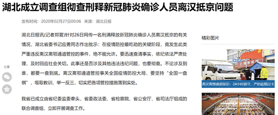 针对26日网传一名刑满释放新冠肺炎确诊人员离汉抵京的有关情况,根据湖北日报凌晨报导,湖北省委书记应勇同志作出批示:在疫情防控最吃劲的关键阶段,竟发生此类严重违反离汉离鄂通道管控的事件,绝不能允许。要迅速查清事实,依纪依法严肃处理,及时回应社会关切。此事还是否涉及其他违法违纪问题,也要彻查。不论涉及到谁,都要一查到底。