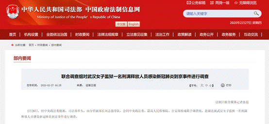 据司法部官网,2月26日,经中央政法委批准,司法部牵头,由分管副部长刘志强带队,会同中央政法委、最高人民检察院、公安部组成联合调查组,赴湖北就武汉女子监狱一名刑满释放人员感染新冠肺炎到京事件进行调查。