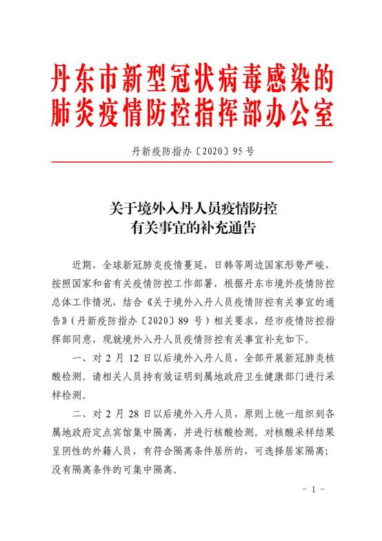 为严防境外疫情输入,辽宁丹东市2日发布关于境外入丹人员疫情防控补充通告: