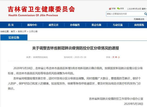 2020年5月18日,吉林省公布吉林市昌邑区新增1例本地新冠肺炎确诊病例。按照国家新冠肺炎疫情分区分级标准,将吉林市昌邑区风险等级由低风险调整为中风险。