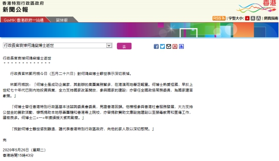 26日下午,香港特区政府网站发布新闻公报称,特首林郑月娥对何鸿燊博士辞世表示深切哀悼。以下为香港特区政府新闻公报全文截图: