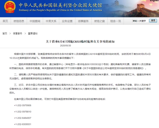 根据中国外交部部署,驻美国使馆将安排符合条件的留学人员搭乘国航CA818华盛顿至深圳临时航班,该航班将于美东时间6月4日16:05从杜勒斯国际机场起飞。现就搭乘航班有关事项提醒如下: